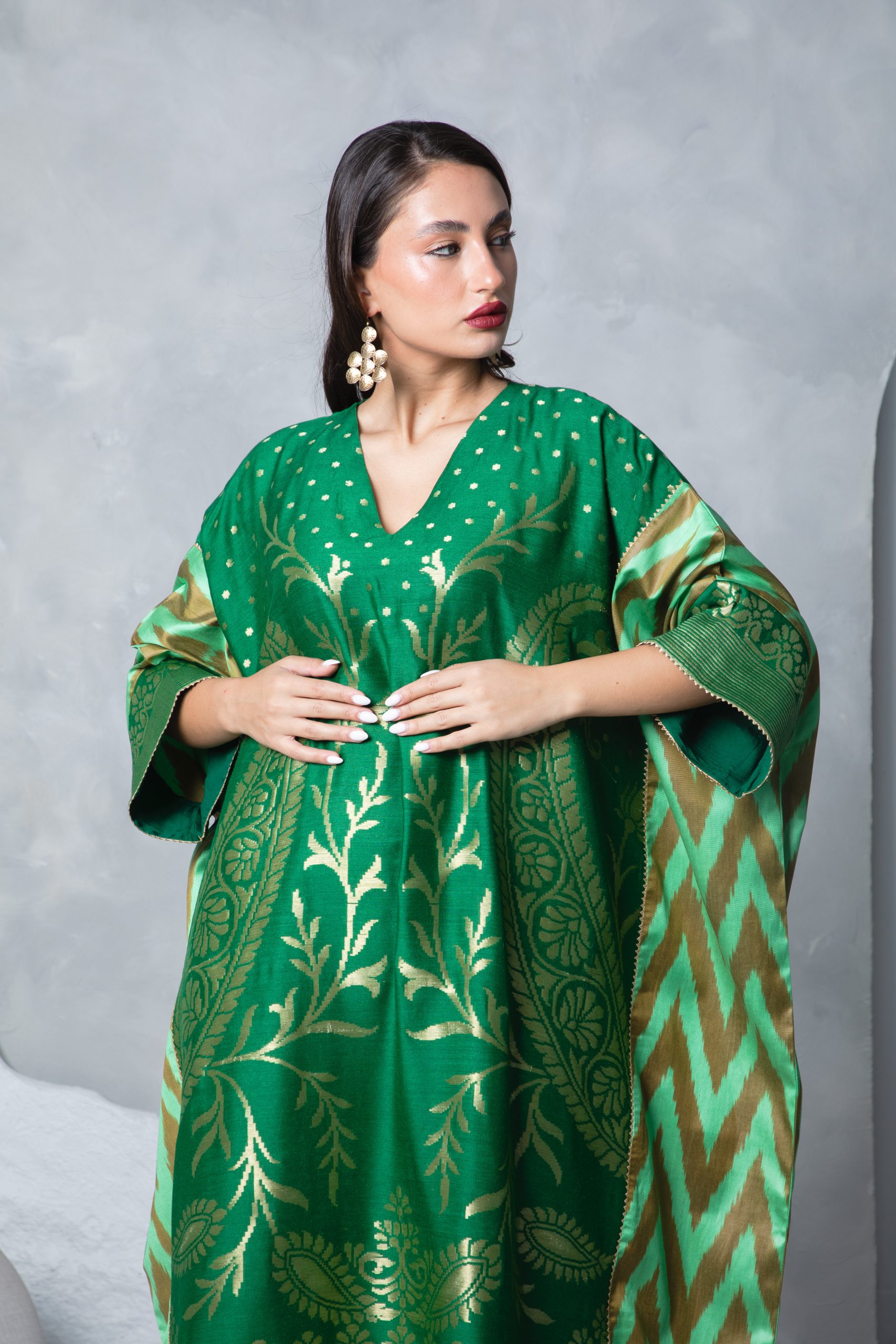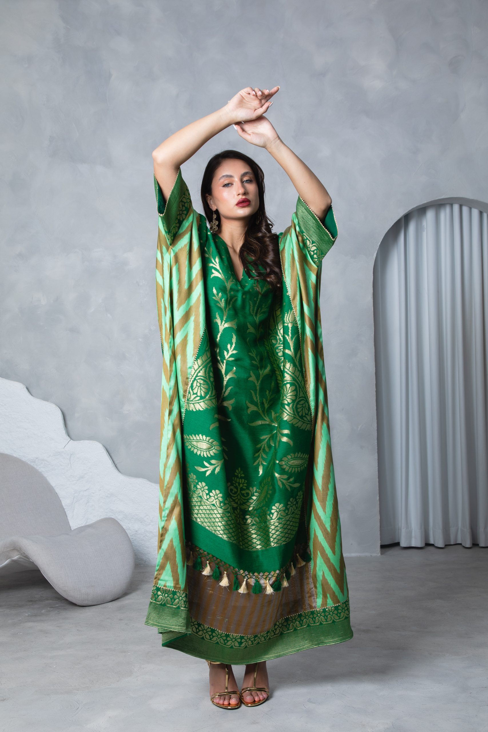 This emerald green kaftan is very special and truly a one-off creation as it features three special handwoven silks – Uzbeki Ikat, silk tissue and muga silk with intricate golden motifs and bold chevron detailing, blending tradition with modern flair. The fluid silhouette and tassel accents add a touch of effortless elegance.