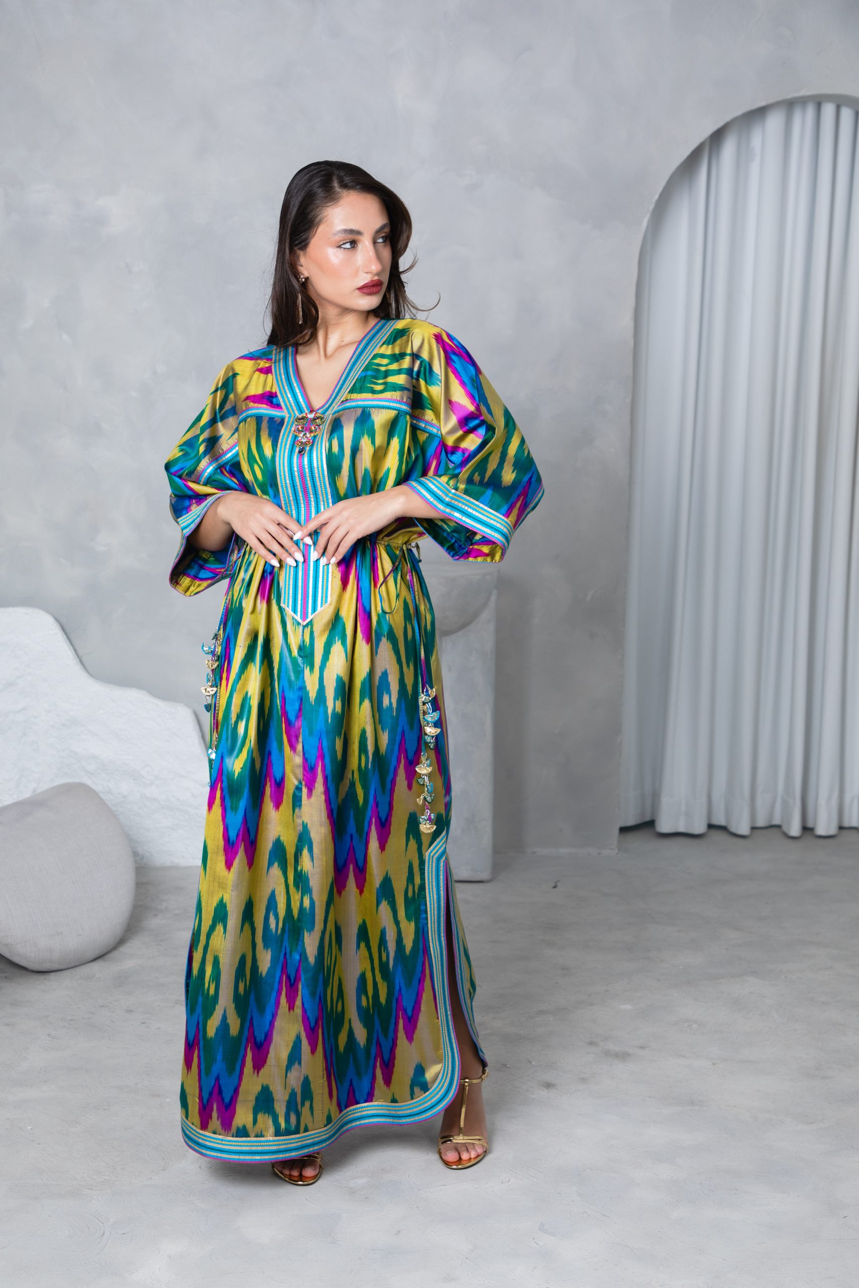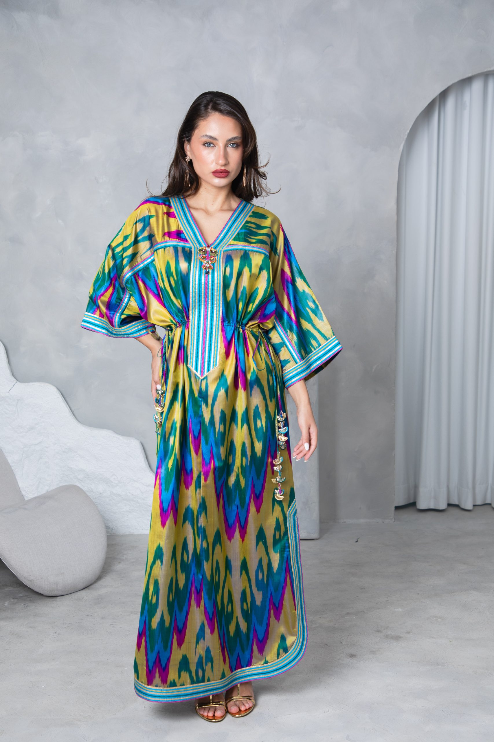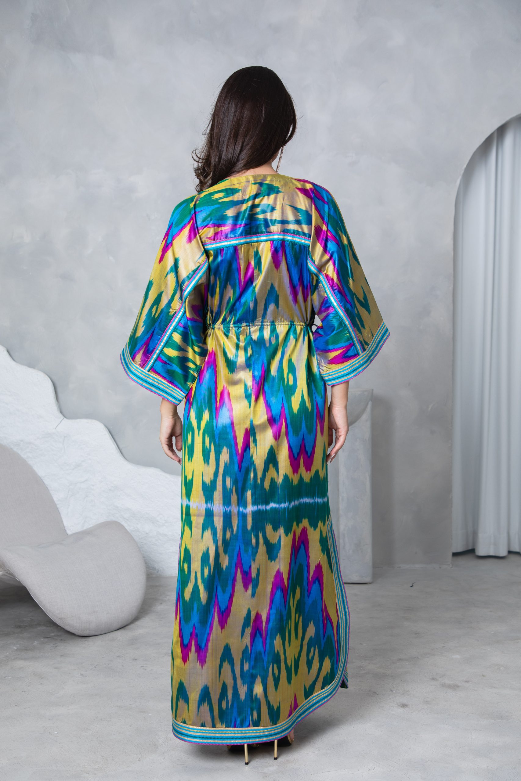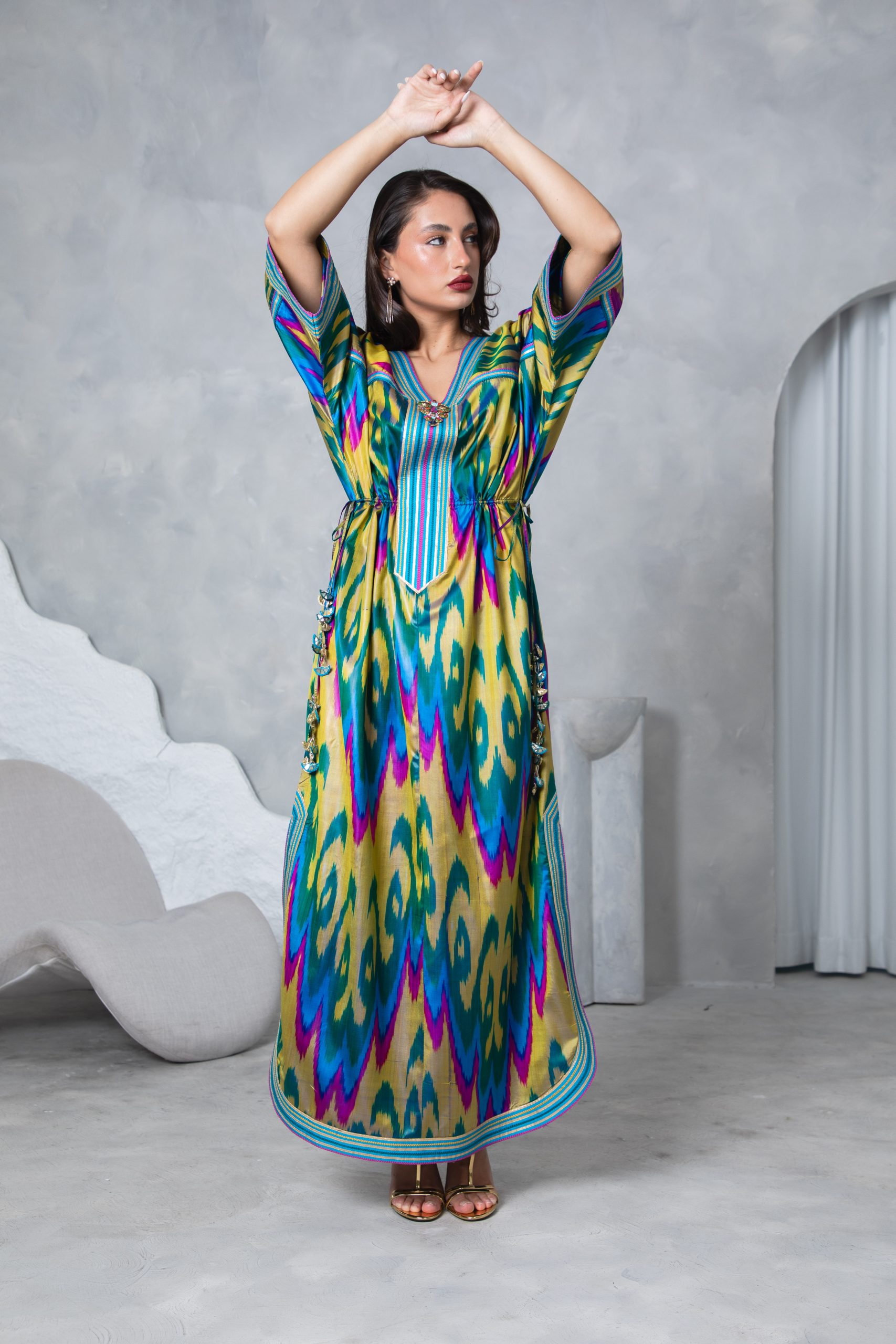 Radiating vibrant energy, this multicolored kaftan features a bold 100% silk Uzbeki Ikat with playful accents of fuchsia, teal, and gold silk thread detailing. Embellished tie-ups on the sides enhance styling of the kaftan and elevates its relaxed silhouette to a stylish statement outfit.