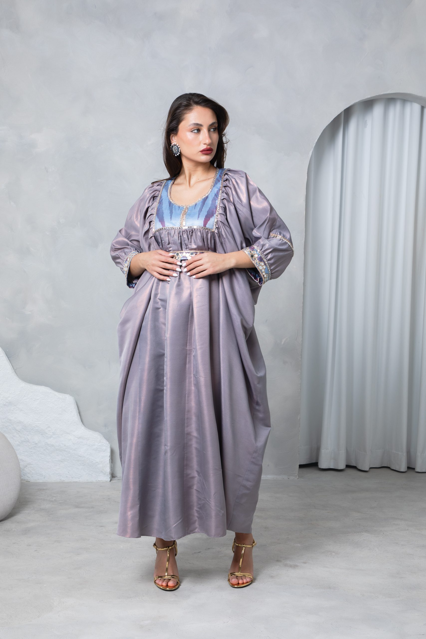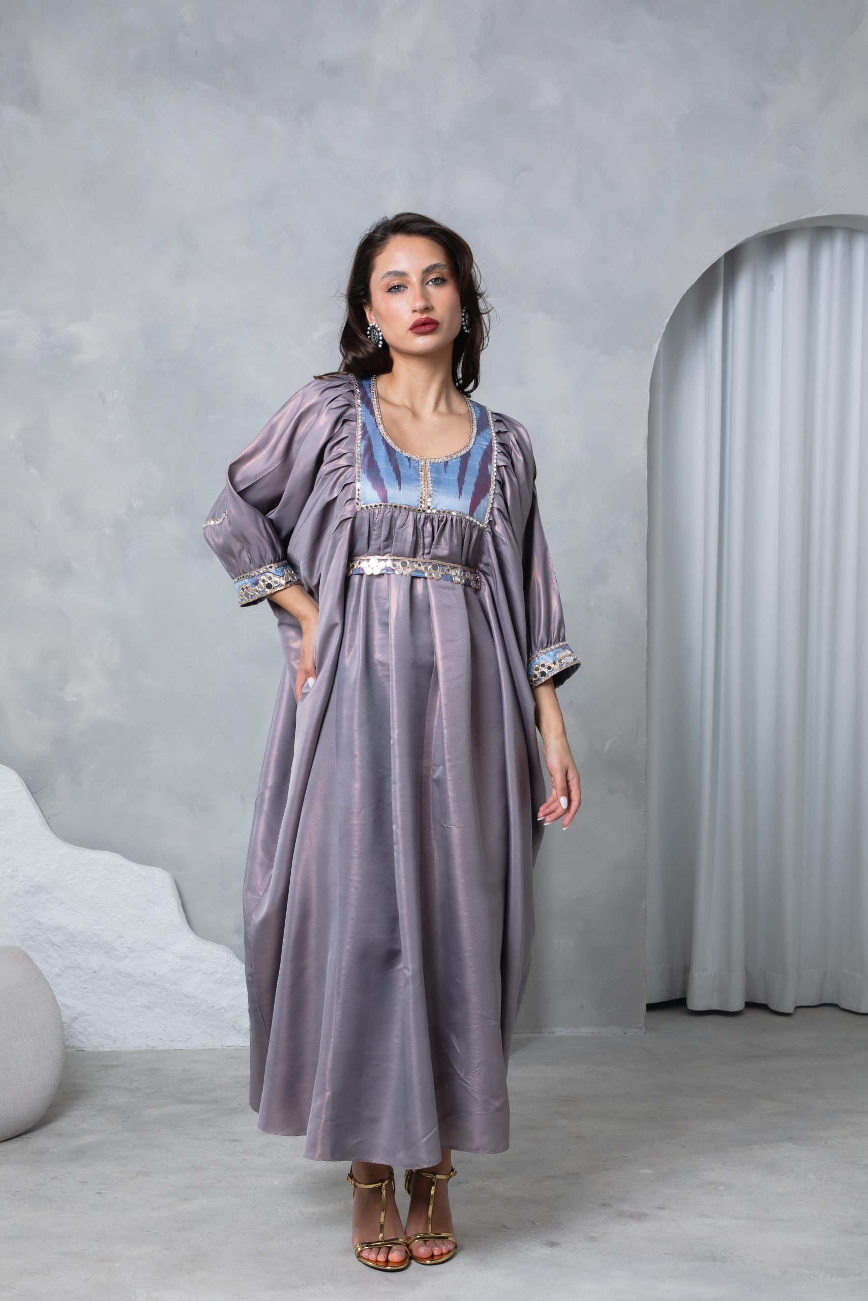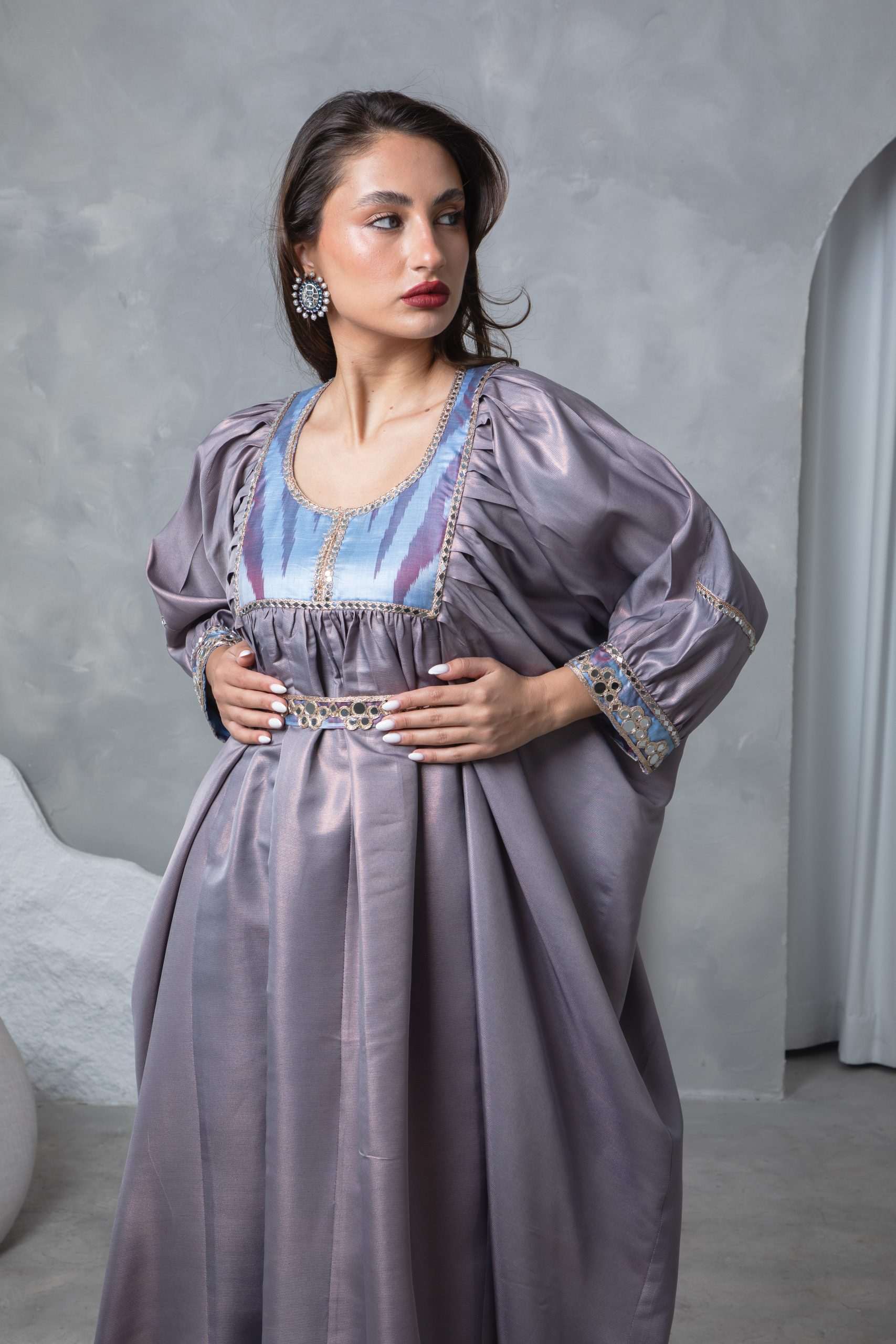 This kaftan exudes elegance with its soft lavender sheen, flowy silhouette, and delicate gathered detailing. The statement yoke of 100% Uzbeki silk ikat and hand-crafted mirror work belt is what transforms this kaftan to a very playfully stylish outfit suitable for fun evenings out.