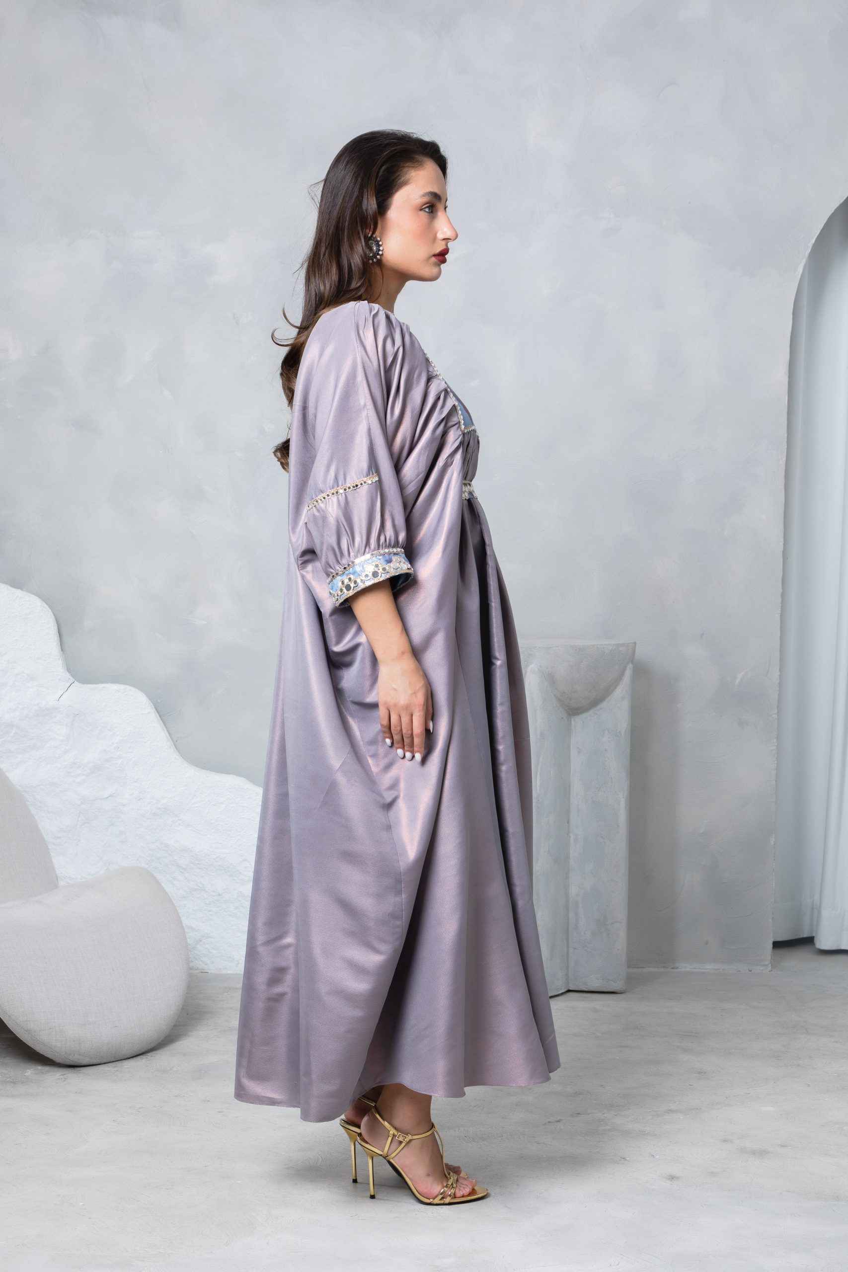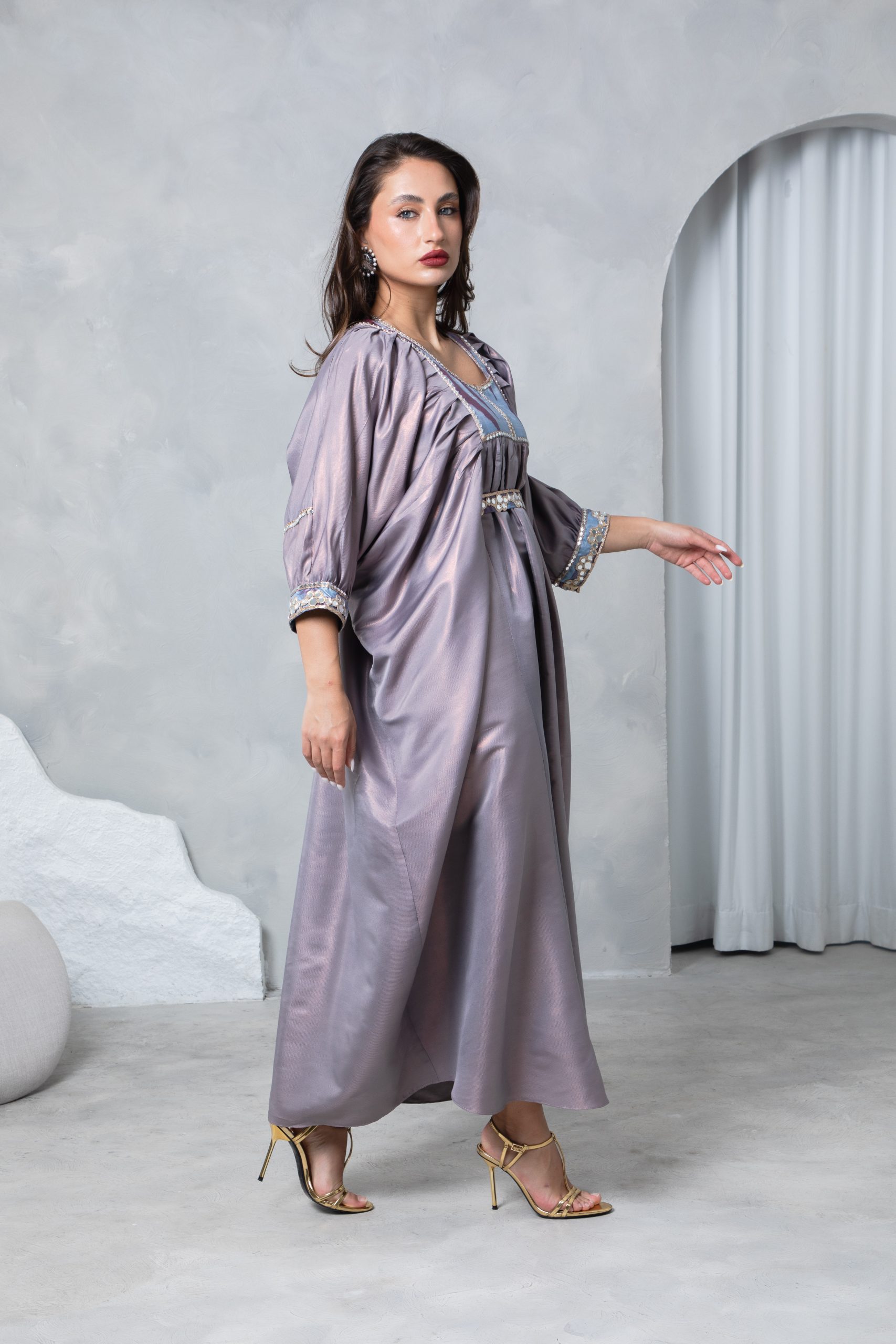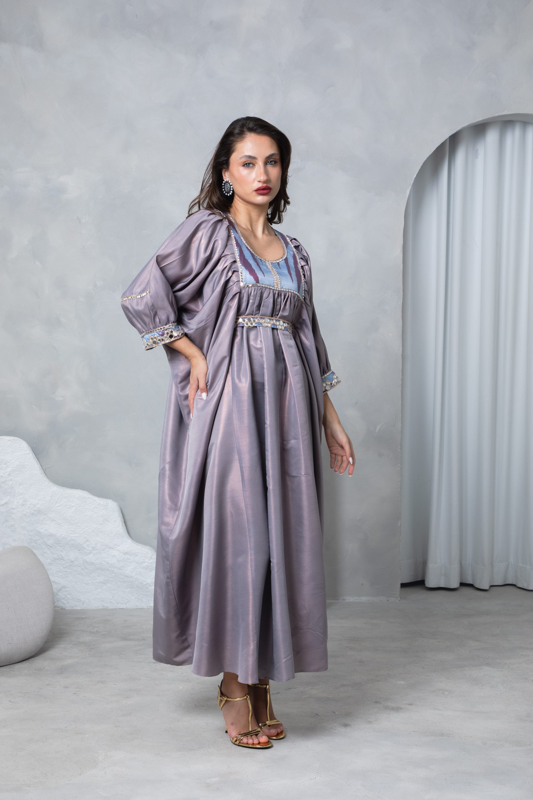 This kaftan exudes elegance with its soft lavender sheen, flowy silhouette, and delicate gathered detailing. The statement yoke of 100% Uzbeki silk ikat and hand-crafted mirror work belt is what transforms this kaftan to a very playfully stylish outfit suitable for fun evenings out.