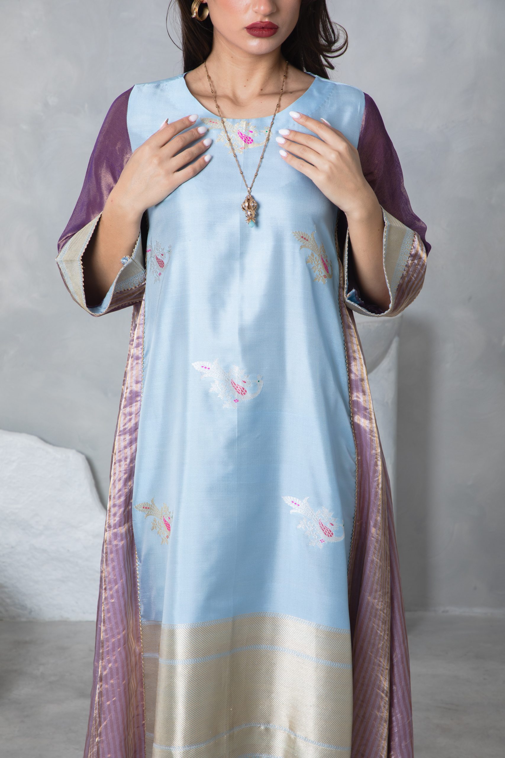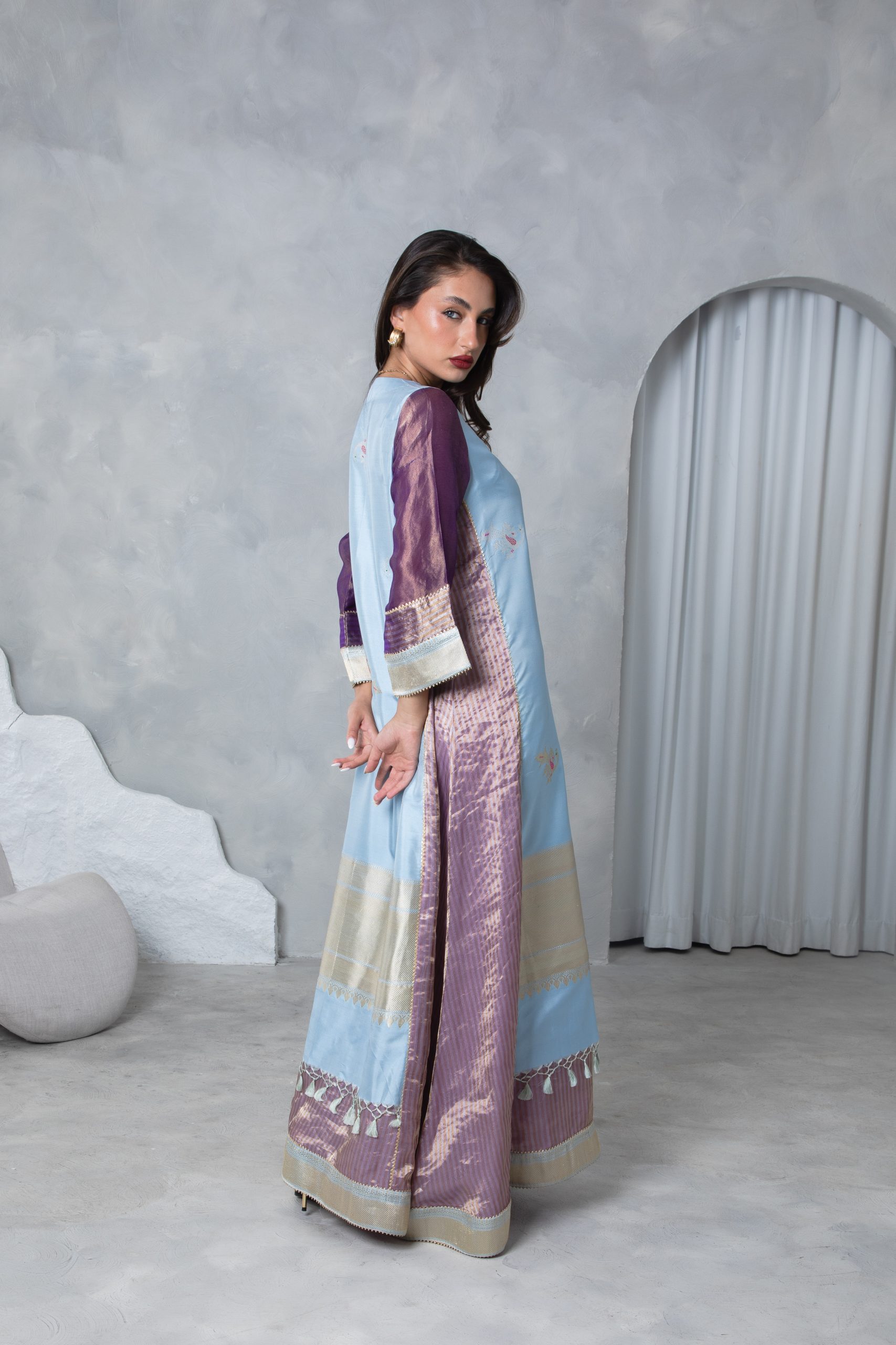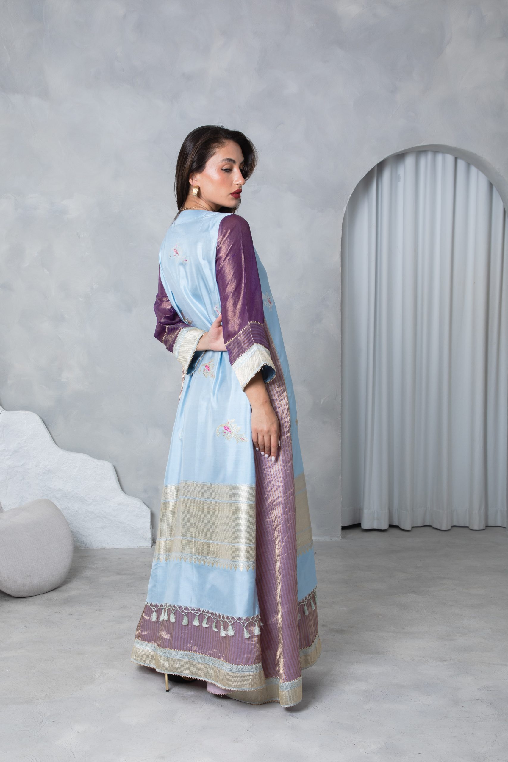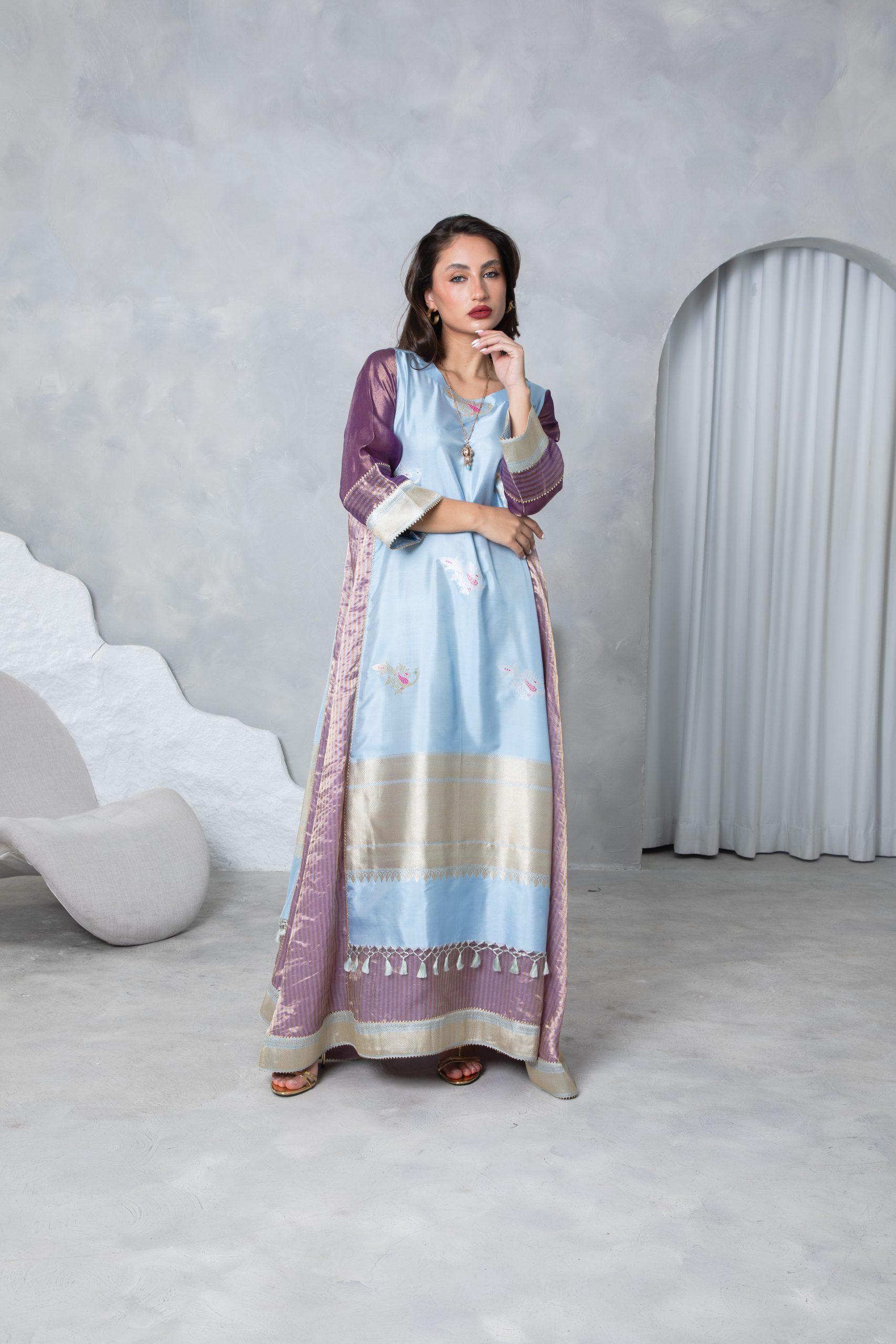 This Lilac kaftan features elements of two exquisite varieties of handwoven Indian silks, tissue and brocade. The different textures of these beautiful silks complement each other to exude a regal look suitable for special soirées and celebrations.