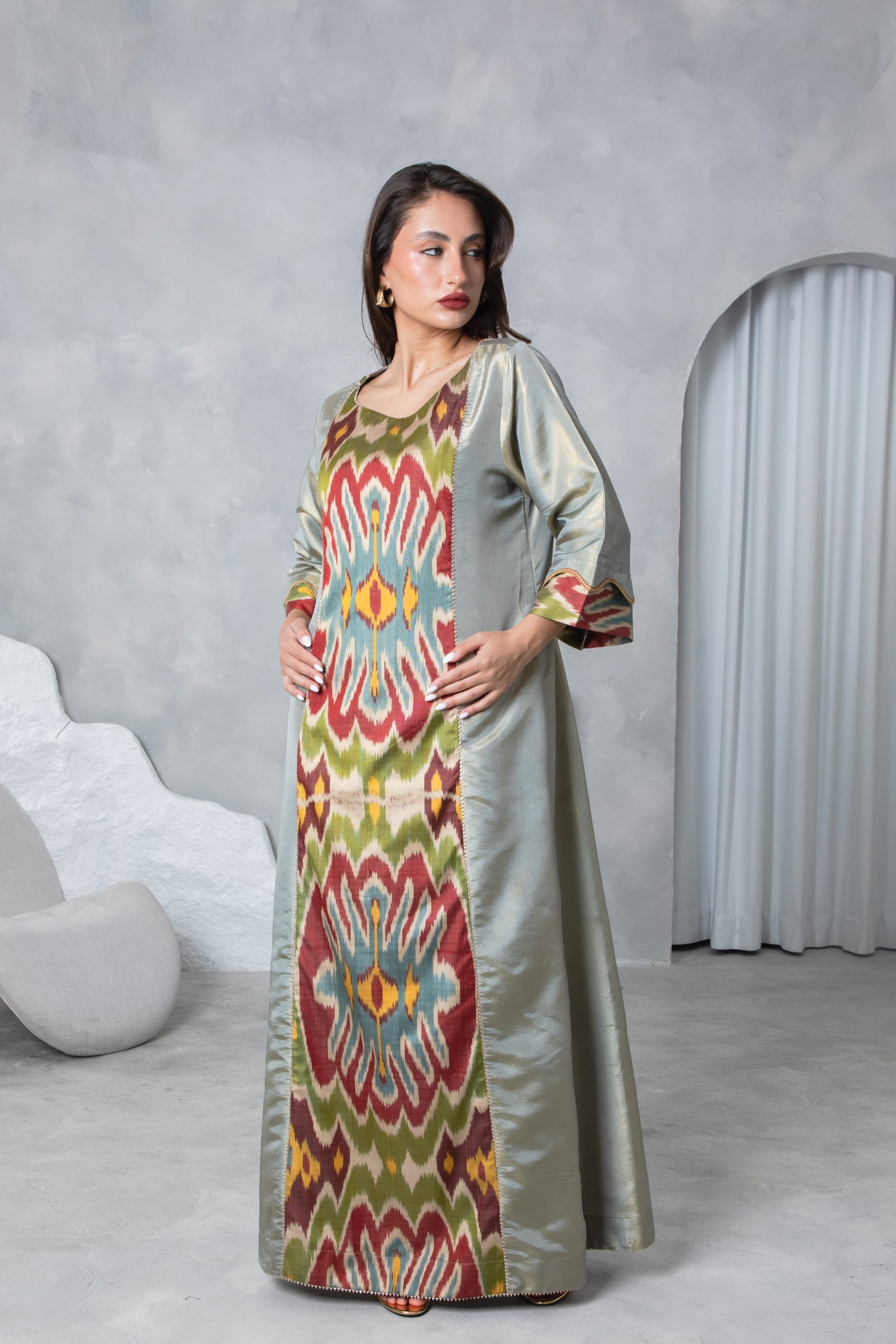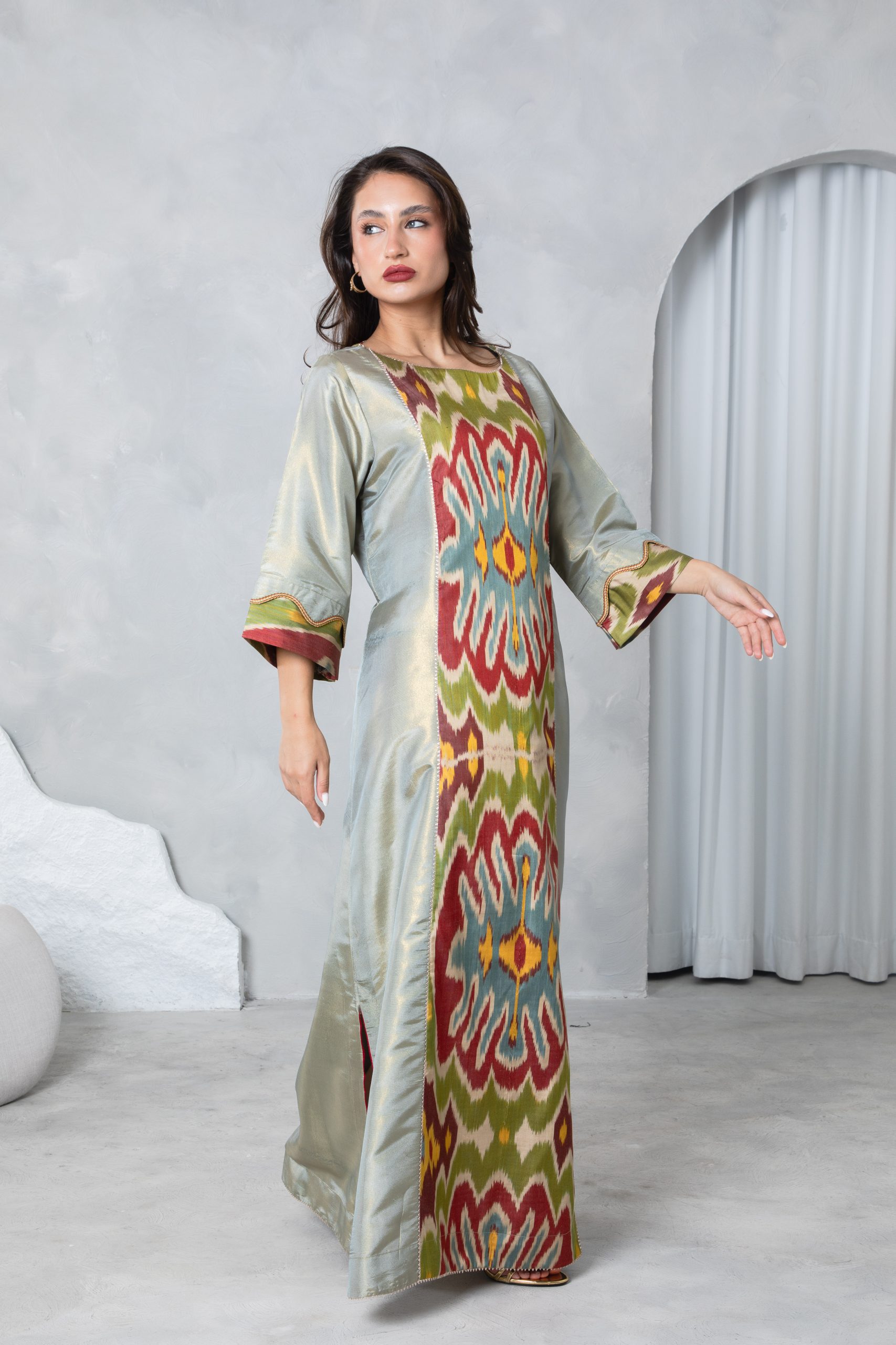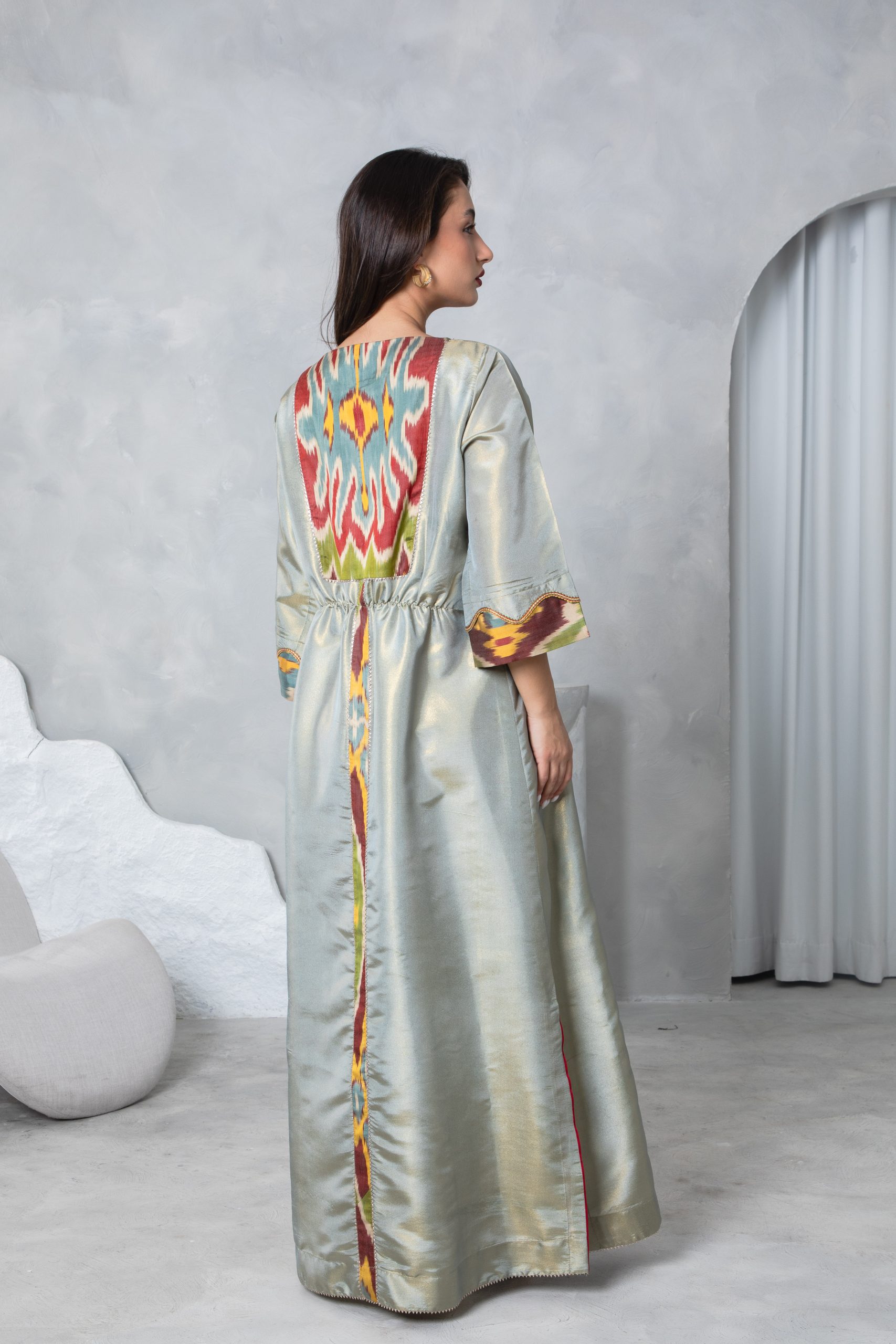 This elegant kaftan features a bold 100% silk Uzbeki ikat panel in earthy tones, creating a vibrant contrast against the soft sage green raw silk. This piece has detailing on the back to add definition at the waist to create a stylish silhouette suitable for special occasions and events.