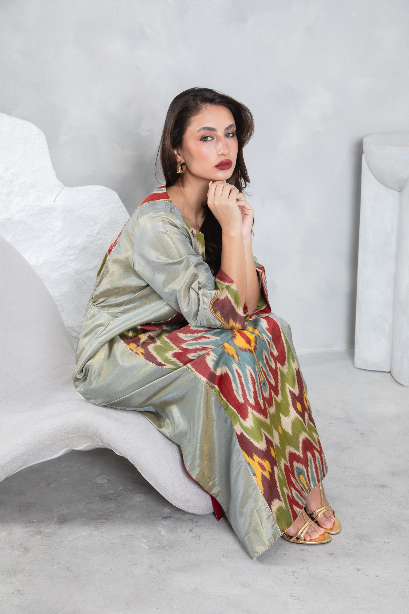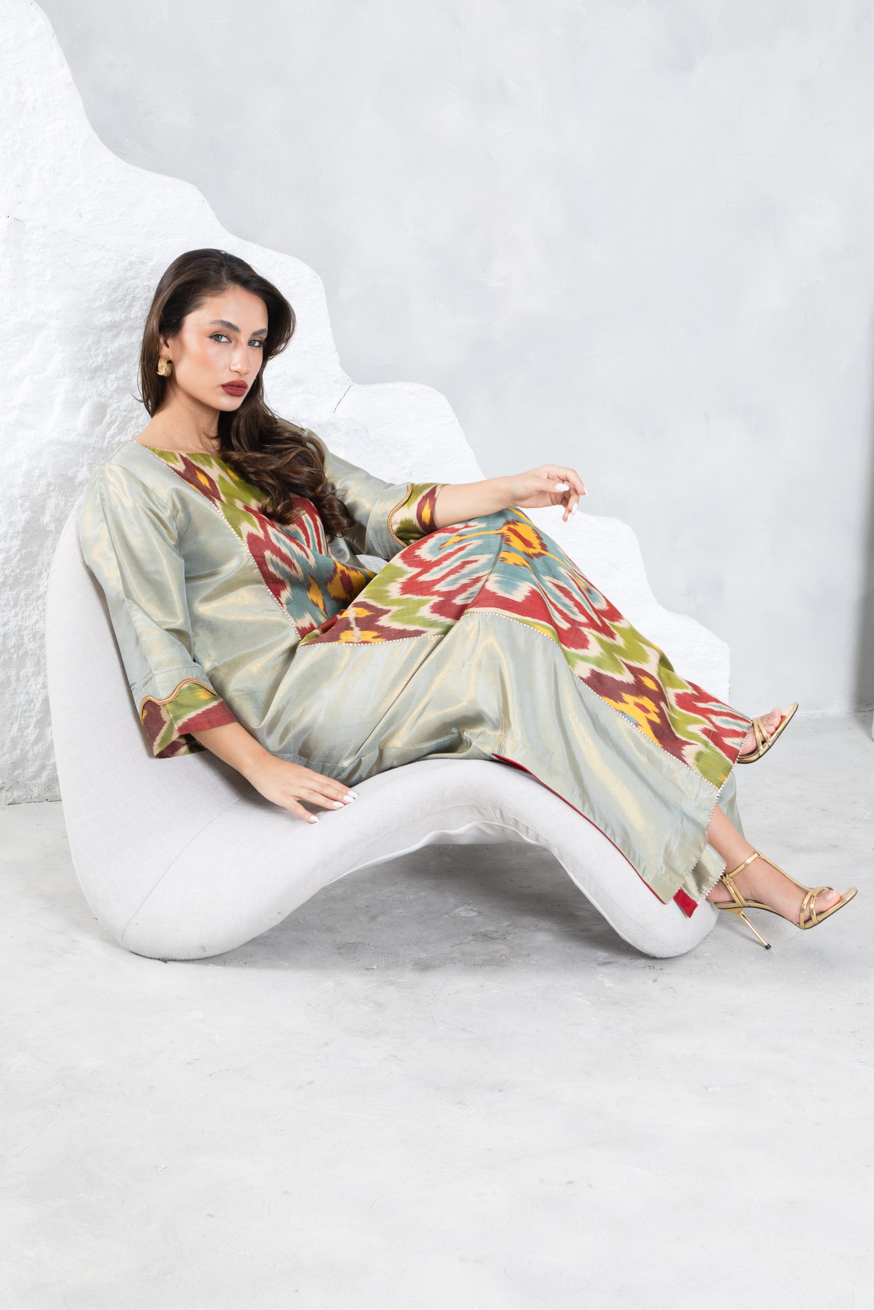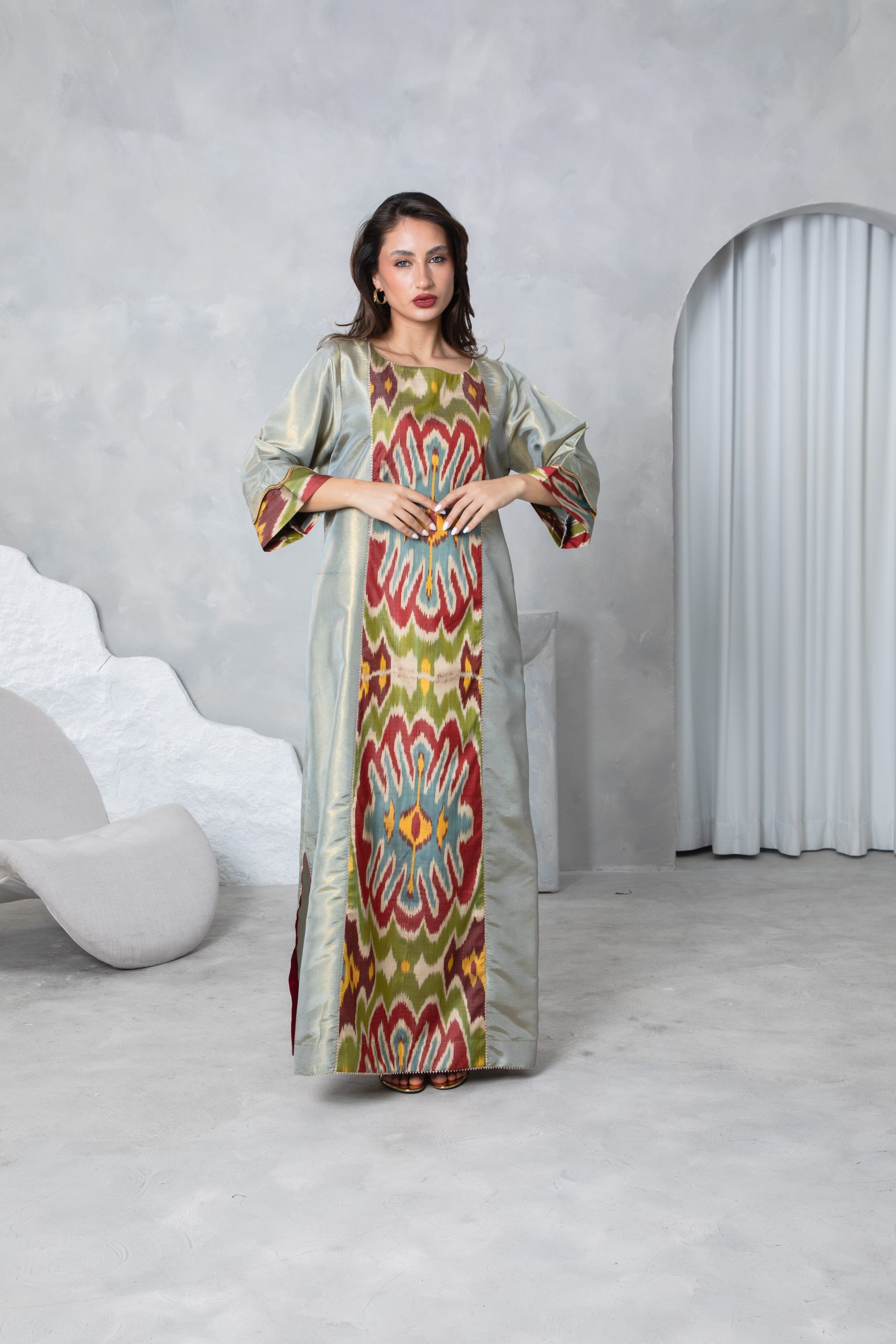 This elegant kaftan features a bold 100% silk Uzbeki ikat panel in earthy tones, creating a vibrant contrast against the soft sage green raw silk. This piece has detailing on the back to add definition at the waist to create a stylish silhouette suitable for special occasions and events.