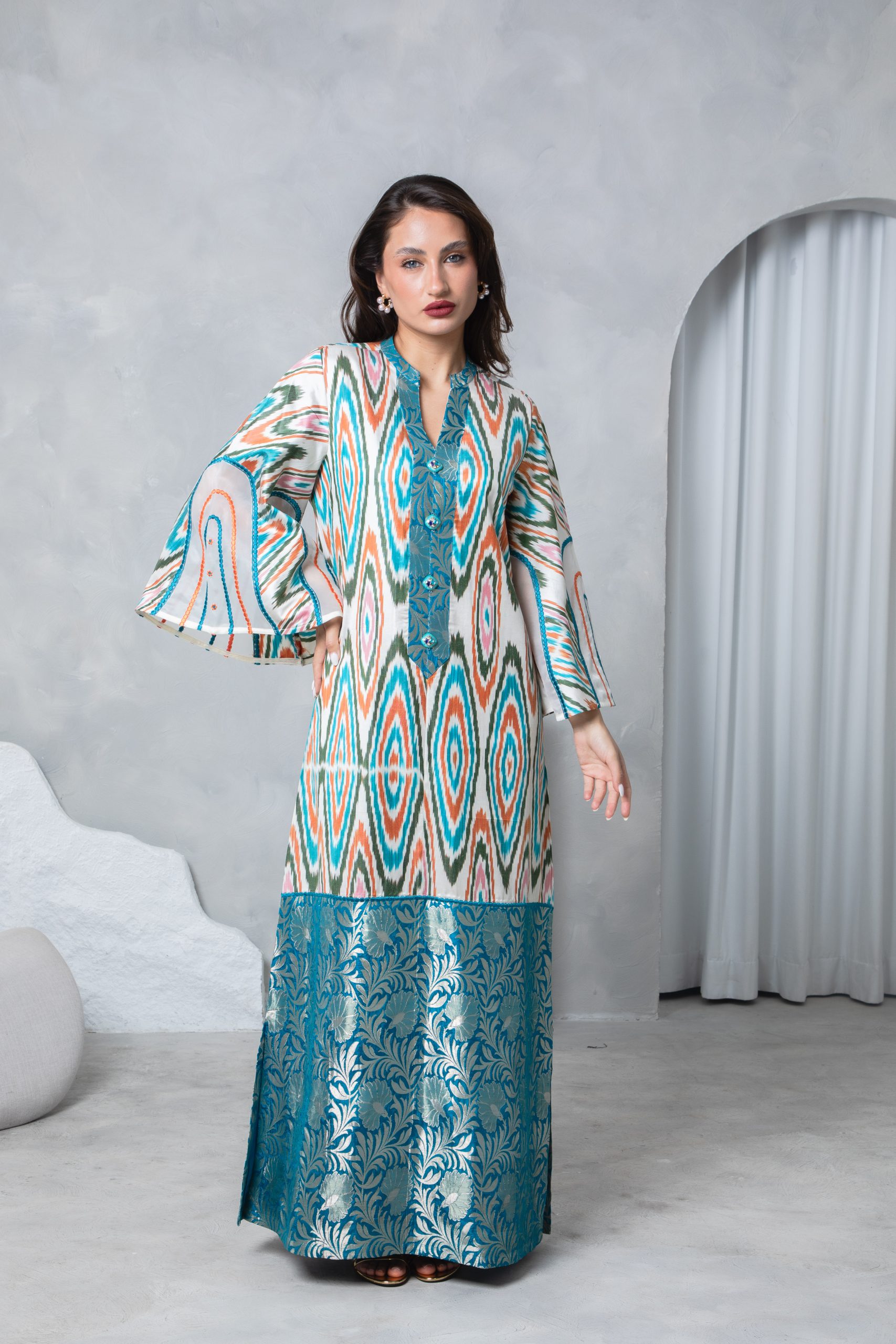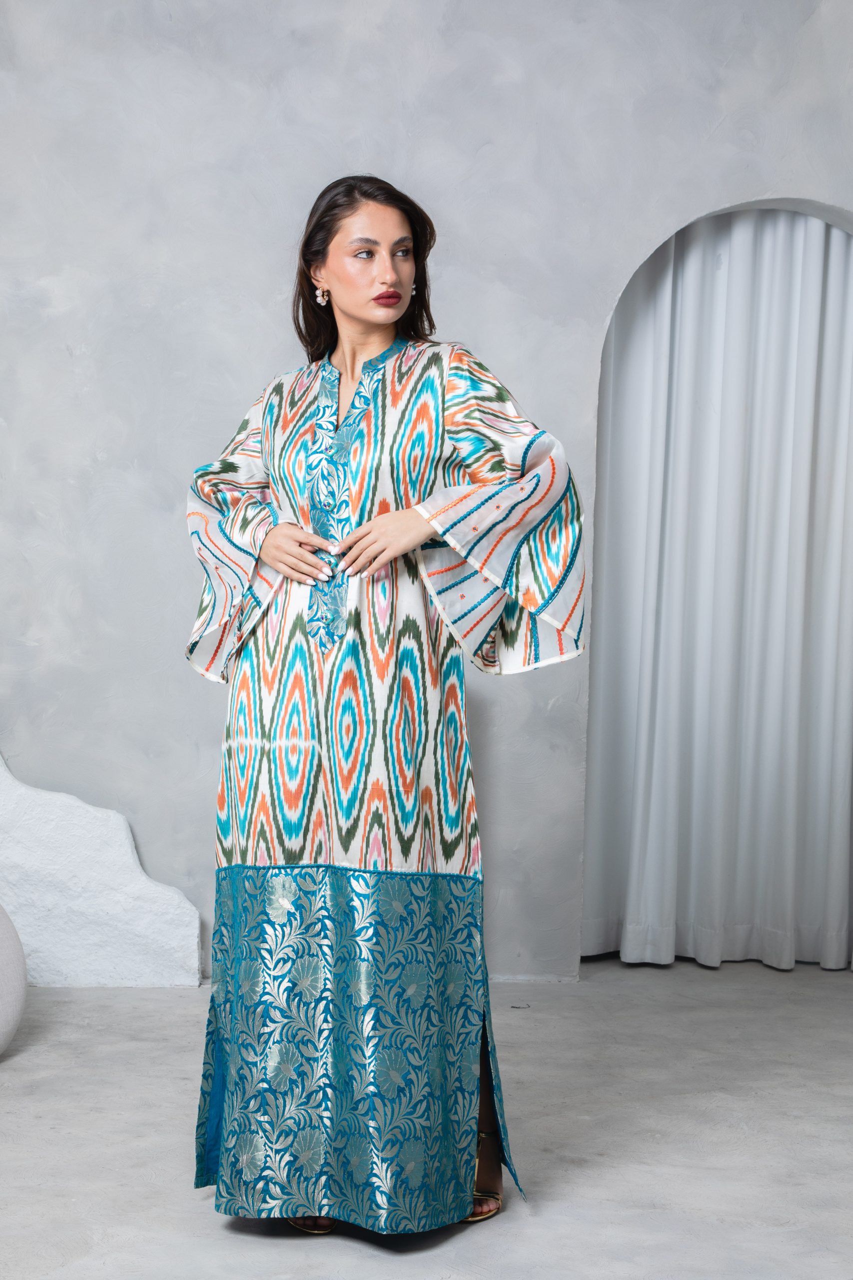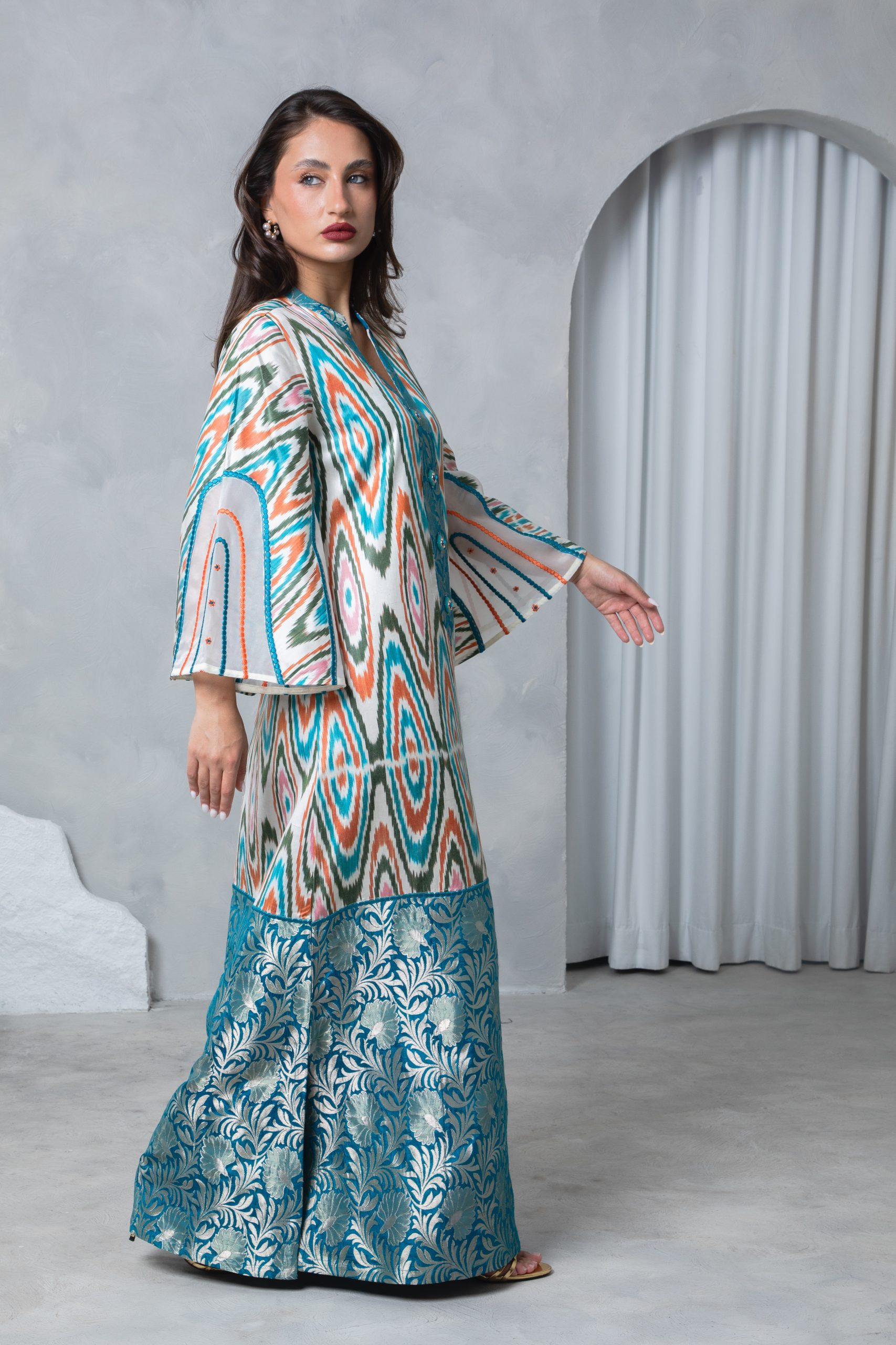 This striking kaftan pairs a vibrant multicolor Uzbeki silk ikat with a richly woven teal silk brocade border for a bold yet elegant look. Bell sleeves with intricate embroidery on silk organza panels add a touch of sophistication and flair.