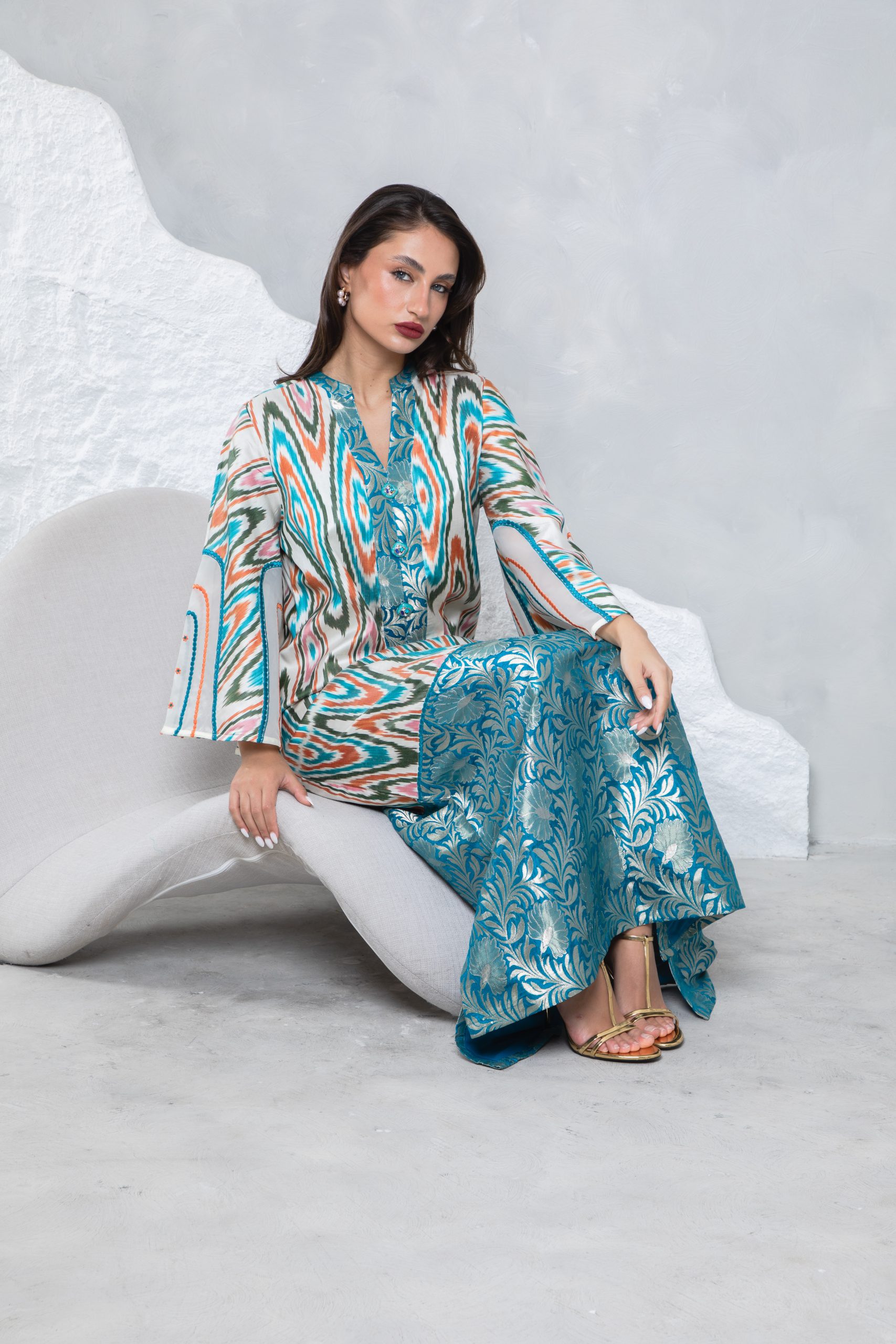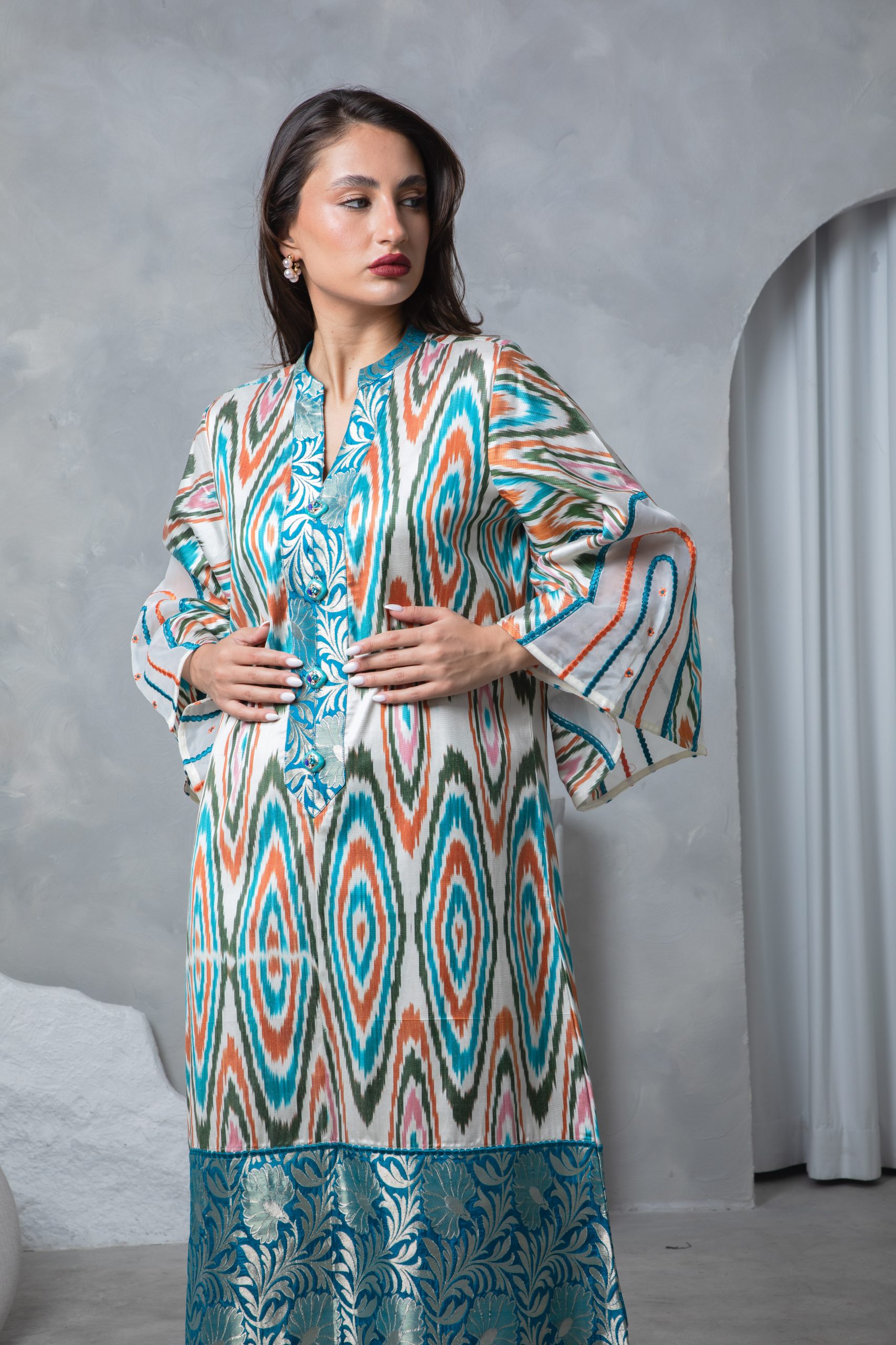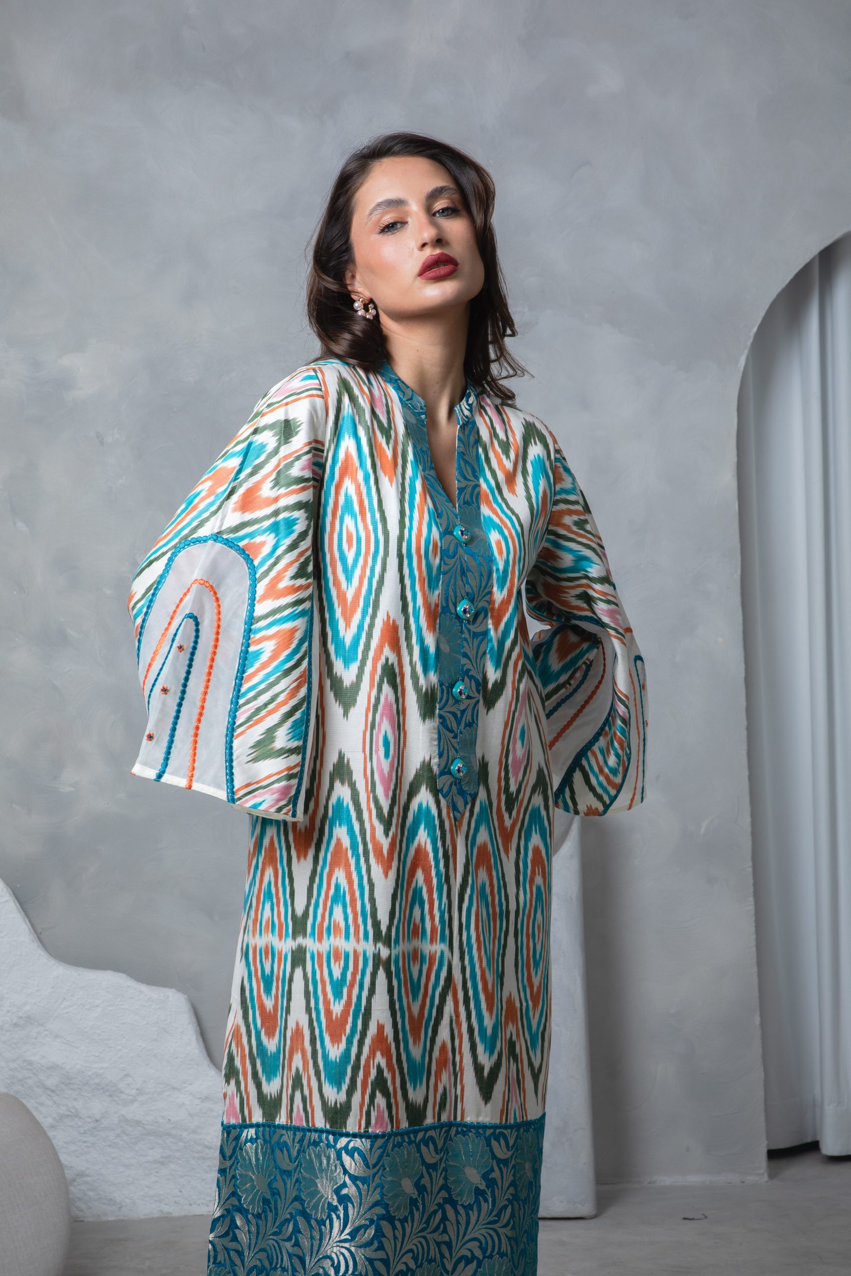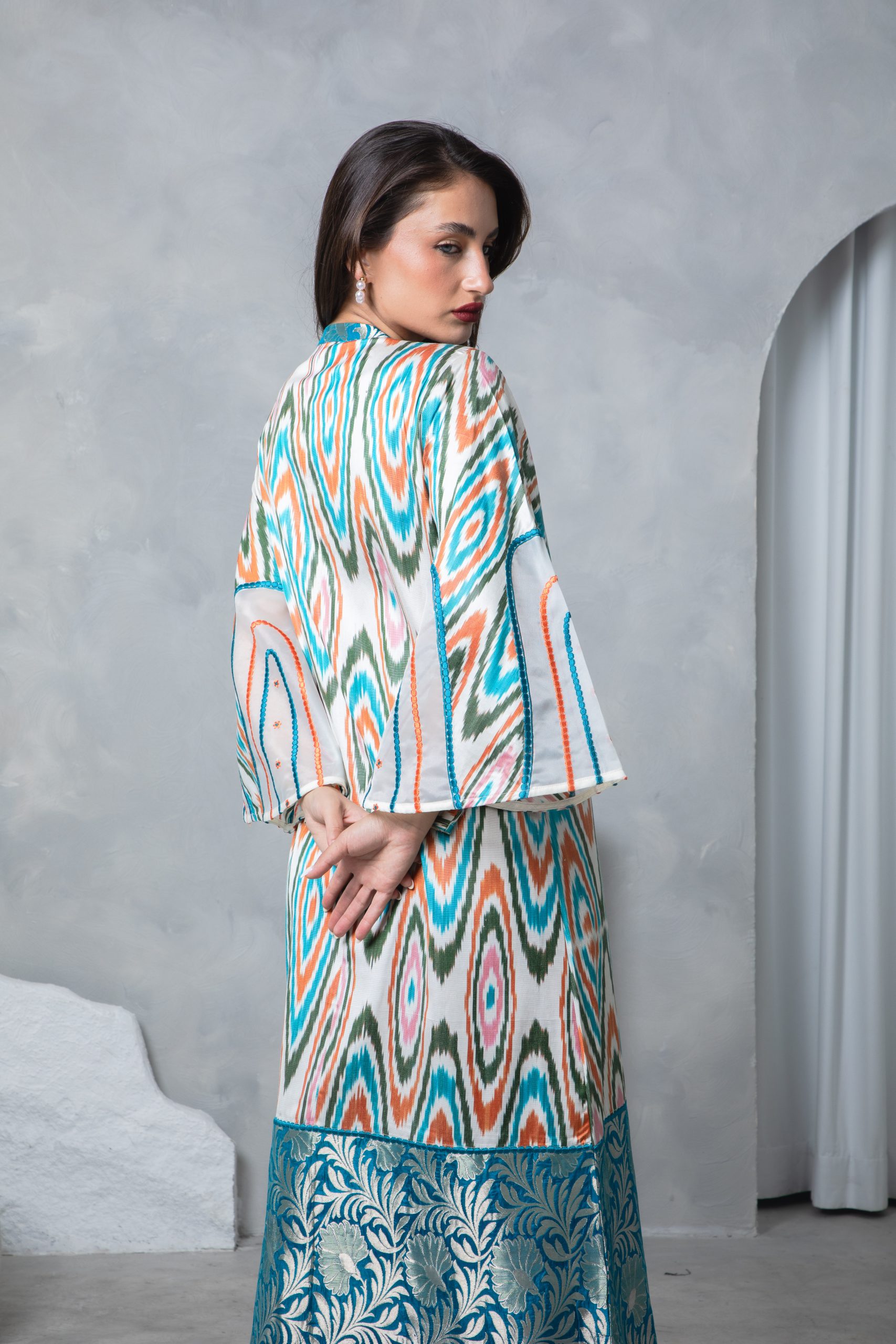 This striking kaftan pairs a vibrant multicolor Uzbeki silk ikat with a richly woven teal silk brocade border for a bold yet elegant look. Bell sleeves with intricate embroidery on silk organza panels add a touch of sophistication and flair.